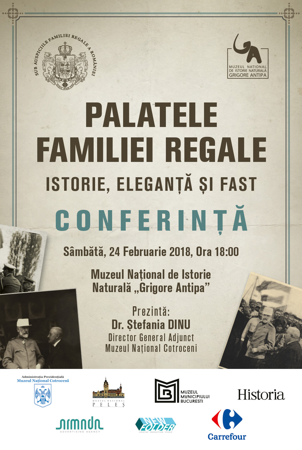 Muzeul Naţional de Istorie Naturală „Grigore Antipa” vă invită să participați la conferința „Palatele familiei regale – istorie, elegaţă şi fast”, care va avea loc sâmbătă, 24 februarie 2018 de la ora 18:00 și va fi susținută de către Dr. Ștefania Dinu, Director General Adjunct al Muzeului Național Cotroceni.