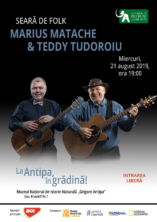 Vă invităm la o seară de folk în grădină la Antipa miercuri, 21 august 2019, de la ora 19:00! Invitații speciali ai serii, Marius Matache și Teddy Tudoroiu ne vor încânta cu un repertoriu de piese îndrăgite ale genului.