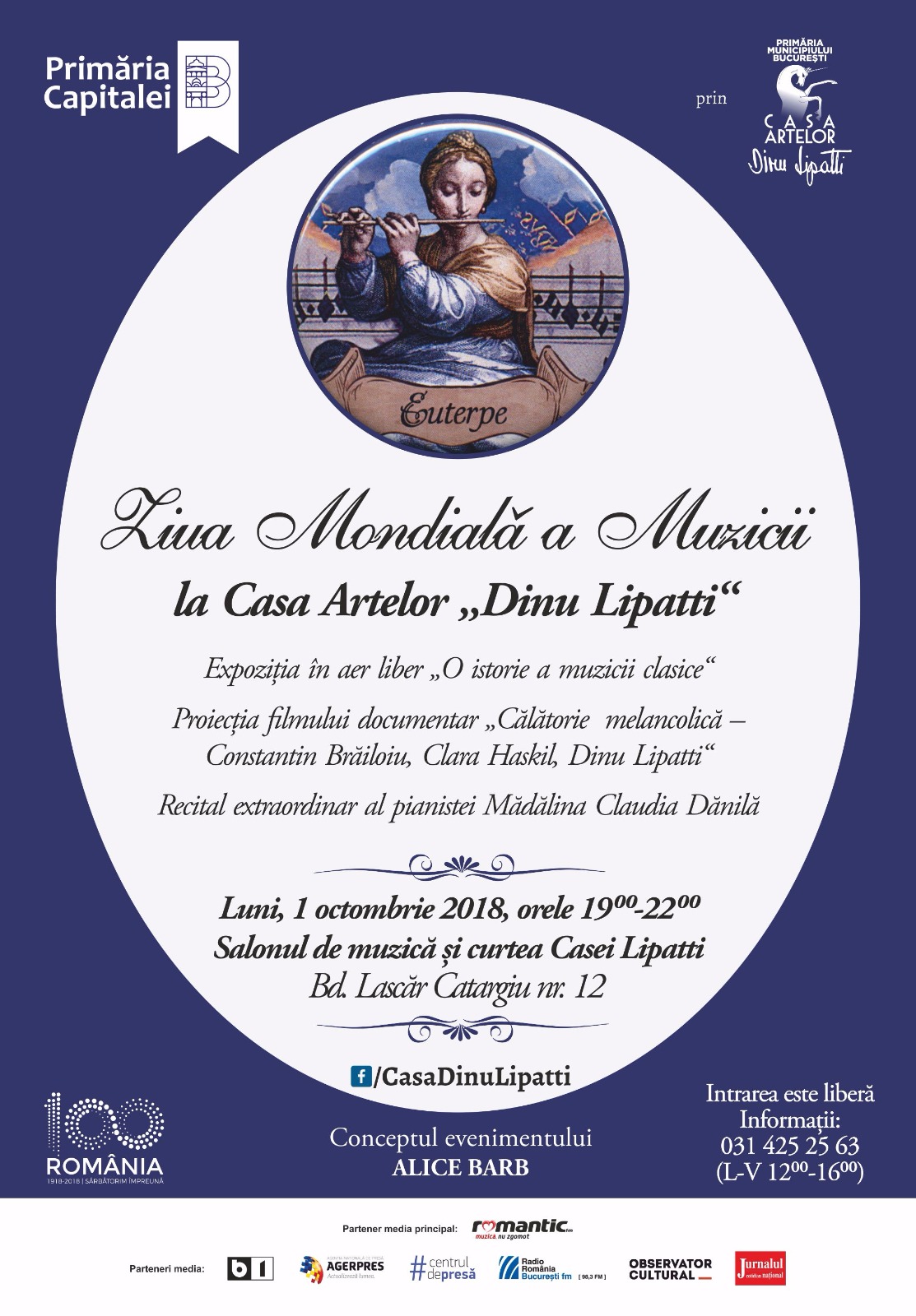 Primăria Municipiului București prin Casa Artelor „Dinu Lipatti” vă invită luni, 1 octombrie 2018, la evenimentul extraordinar “Ziua Mondială a Muzicii la Casa Artelor Dinu Lipatti”, eveniment prilejuit de celebrarea oficială, internațională, a Muzicii – limbajul universal al omenirii.