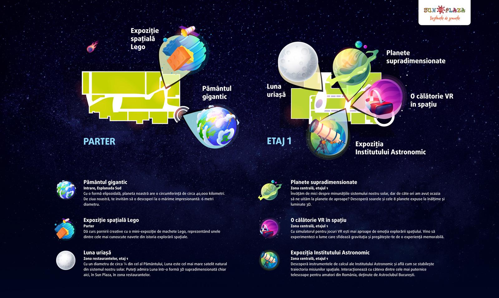 Sistemul solar va putea fi văzut de aproape la etajul 1, zona centrală, unde soarele și cele 8 planete vor fi expuse la înălțime.