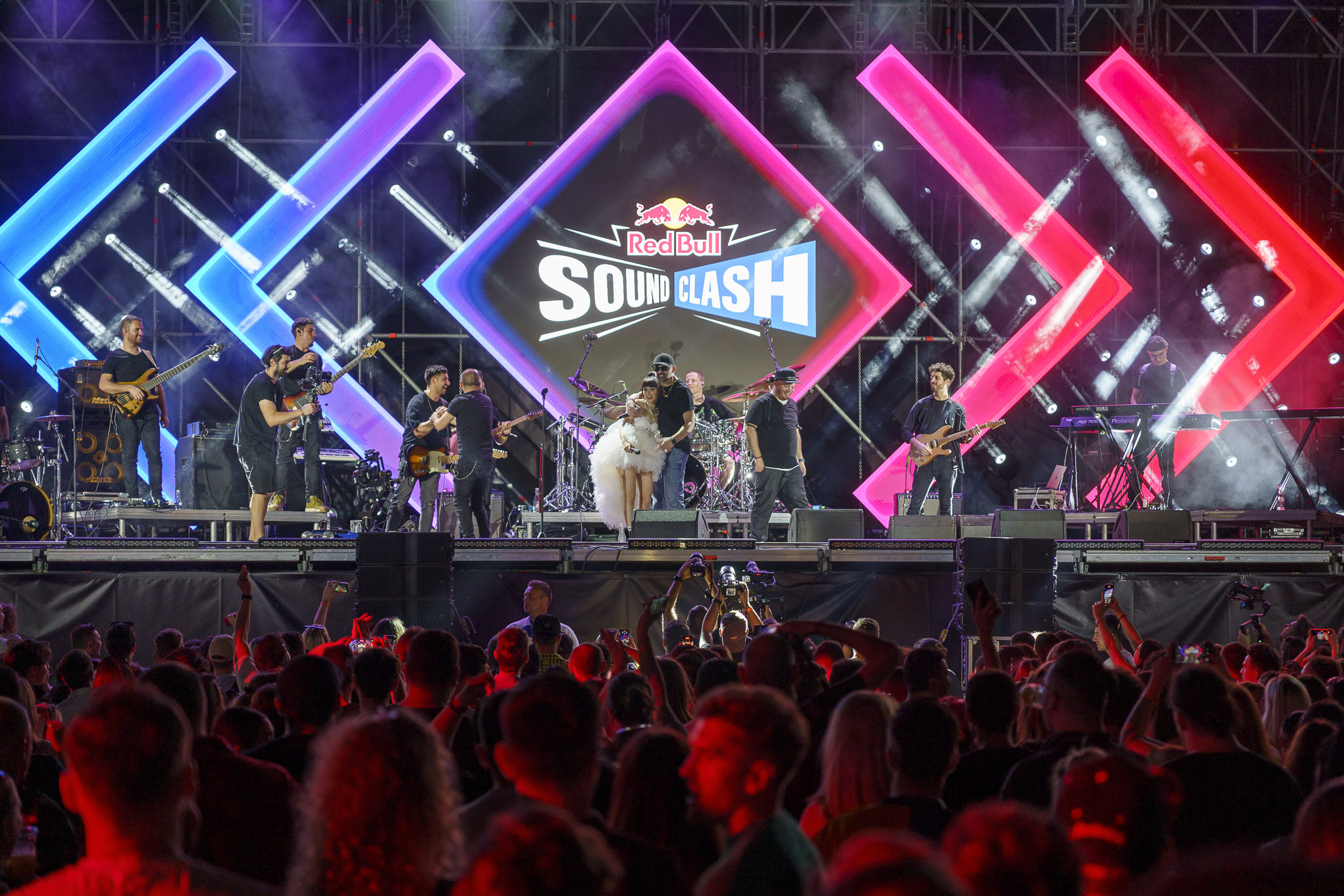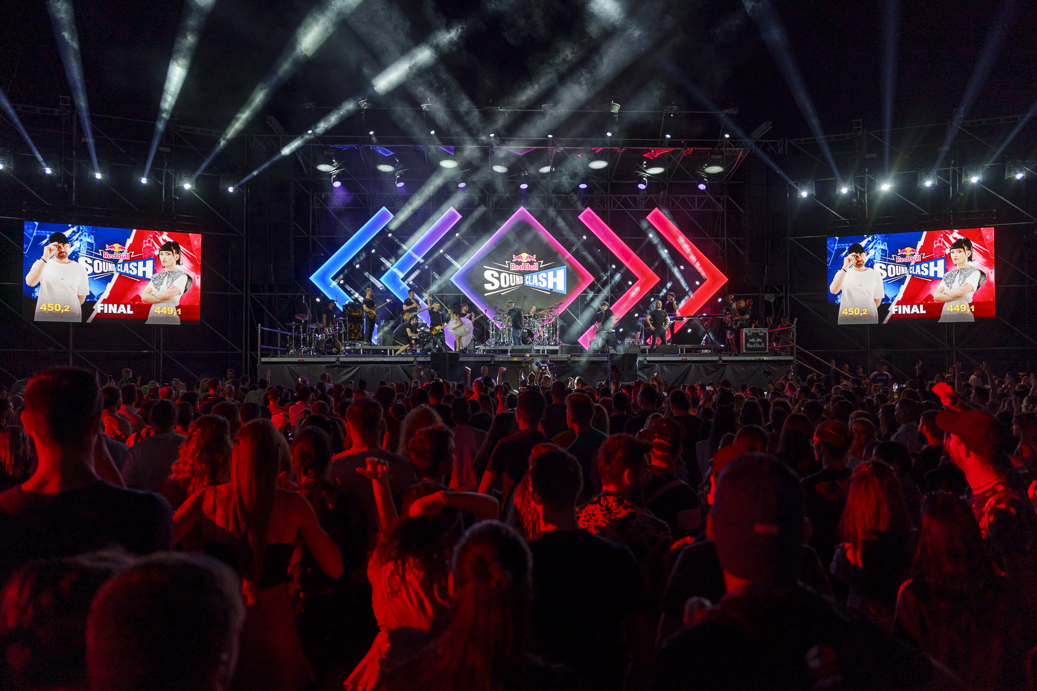 Red Bull SoundClash este o experiență unică, un moment de rivalitate artistică ce forțează adversarii să-și depășească cu mult zona de confort și să se arunce cu toată imaginația într-o luptă a ritmurilor și a aranjamentelor muzicale. Două scene față-n față, 4 runde total diferite, care-i solicită creativ de fiecare dată altfel, un decibelmetru ce măsoară toate aplauzele: rețeta imbatabilă pentru un show inconfundabil!