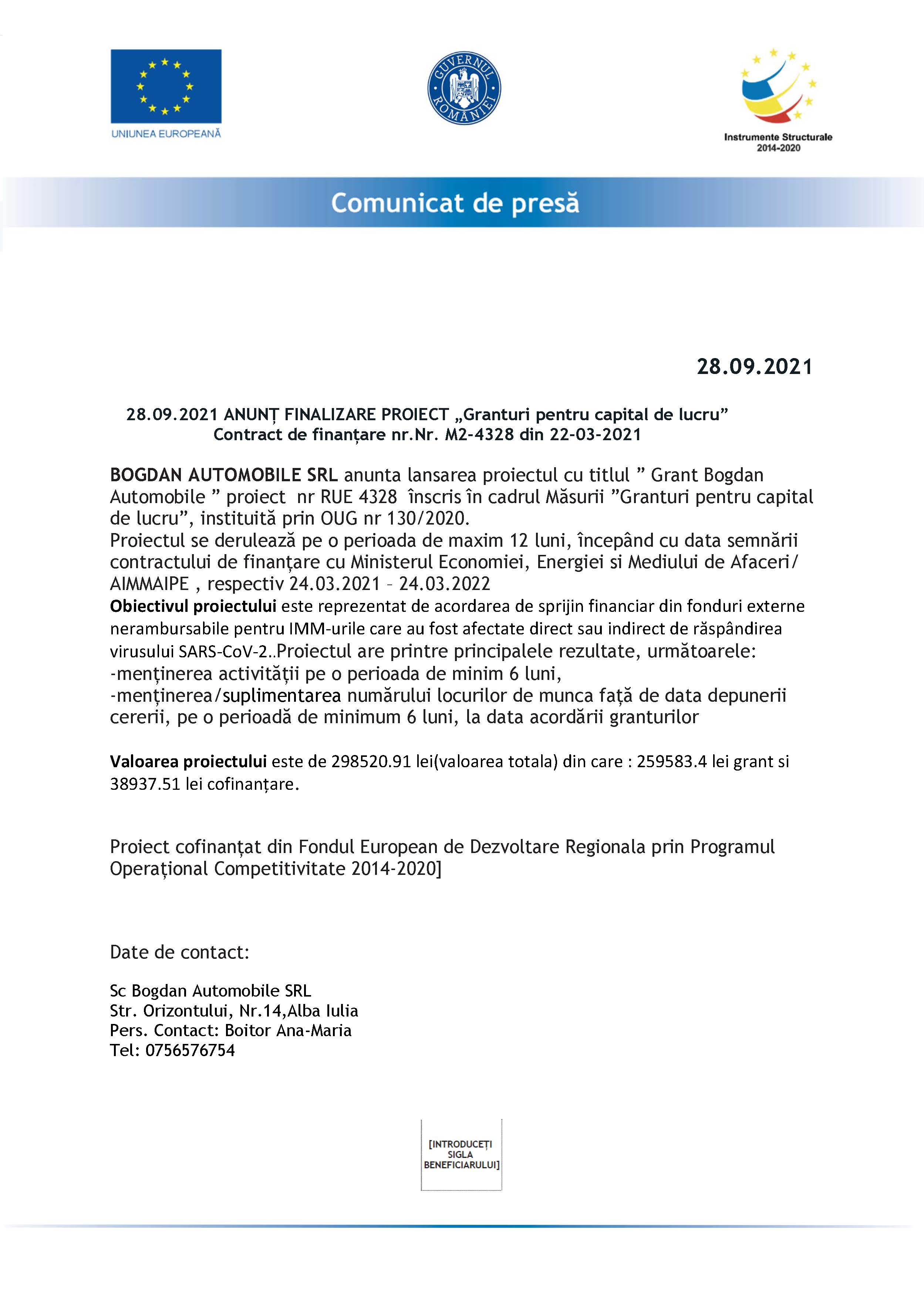 BOGDAN AUTOMOBILE SRL anunța finalizarea proiectului cu titlul ”Grant Bogdan Automobile ”, nr. RUE 4328, înscris în cadrul Măsurii ”Granturi pentru capital de lucru”, instituită prin OUG nr. 130/2020.