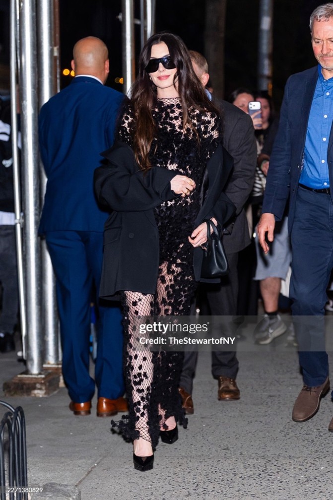 Anne a purtat ținuta numărul 53 Calvin Klein Collection Fall 2026, o rochie neagră din plasă fină, cu noduri mici, decorată cu aplicații florale din organza cu franjuri delicate.