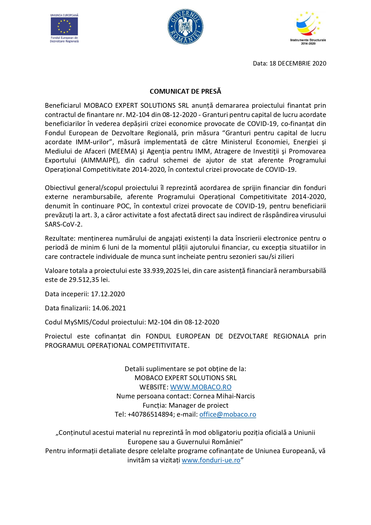 Beneficiarul MOBACO EXPERT SOLUTIONS SRL anunță demararea proiectului finantat prin contractul de finantare nr. M2-104 din 08-12-2020 – Granturi pentru capital de lucru acordate beneficiarilor în vederea depășirii crizei economice provocate de COVID-19, co-finanțat din Fondul European de Dezvoltare Regională, prin măsura “Granturi pentru capital de lucru acordate IMM-urilor”, măsură implementată de către Ministerul Economiei, Energiei şi Mediului de Afaceri (MEEMA) şi Agenţia pentru IMM, Atragere de Investiţii şi Promovarea Exportului (AIMMAIPE), din cadrul schemei de ajutor de stat aferente Programului Operațional Competitivitate 2014-2020, în contextul crizei provocate de COVID-19.