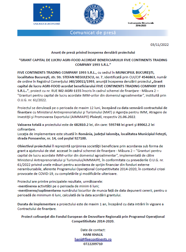 FIVE CONTINENTS TRADING COMPANY 1993 S.R.L., cu sediul în MUNICIPIUL BUCUREŞTI, localitatea Bucureşti, str. Str. STEFAN NEGULESCU, nr. 7, identificată prin CUI/CIF 4546863, număr de ordine în Registrul Comerţului J40/20011/1993, anunţă începerea derulării proiectul „Grant capital de lucru AGRI-FOOD acordat beneficiarului FIVE CONTINENTS TRADING COMPANY 1993 S.R.L..”, proiect cu nr. RUE M2-AGRI-1155 înscris în cadrul schemei de finanţare – Măsura 2 – ”Granturi pentru capital de lucru acordate IMM-urilor din domeniul agroalimentar”, instituită prin O.U.G. nr. 61/2022.