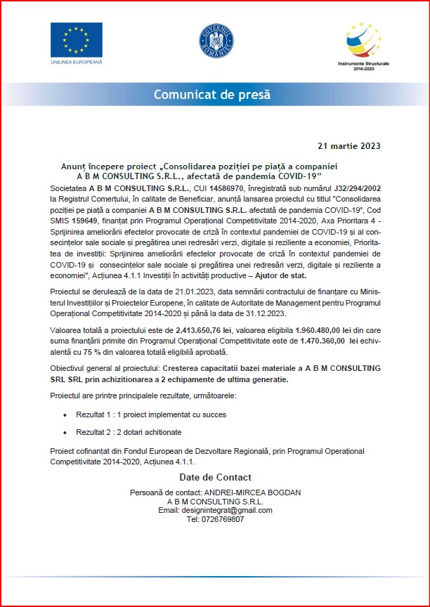 Societatea A B M CONSULTING S.R.L., CUI 14586970, înregistrată sub numărul J32/294/2002 la Registrul Comerțului, în calitate de Beneficiar, anunță lansarea proiectul cu titlul ”Consolidarea poziției pe piață a companiei A B M CONSULTING S.R.L. afectată de pandemia COVID-19”, Cod SMIS 159649, finanțat prin Programul Operațional Competitivitate 2014-2020, Axa Prioritara 4 – Sprijinirea ameliorării efectelor provocate de criză în contextul pandemiei de COVID-19 și al con-secințelor sale sociale și pregătirea unei redresări verzi, digitale și reziliente a economiei, Priorita-tea de investiții: Sprijinirea ameliorării efectelor provocate de criză în contextul pandemiei de COVID-19 și consecințelor sale sociale și pregătirea unei redresări verzi, digitale și reziliente a economiei”, Acțiunea 4.1.1 Investiții în activități productive – Ajutor de stat.