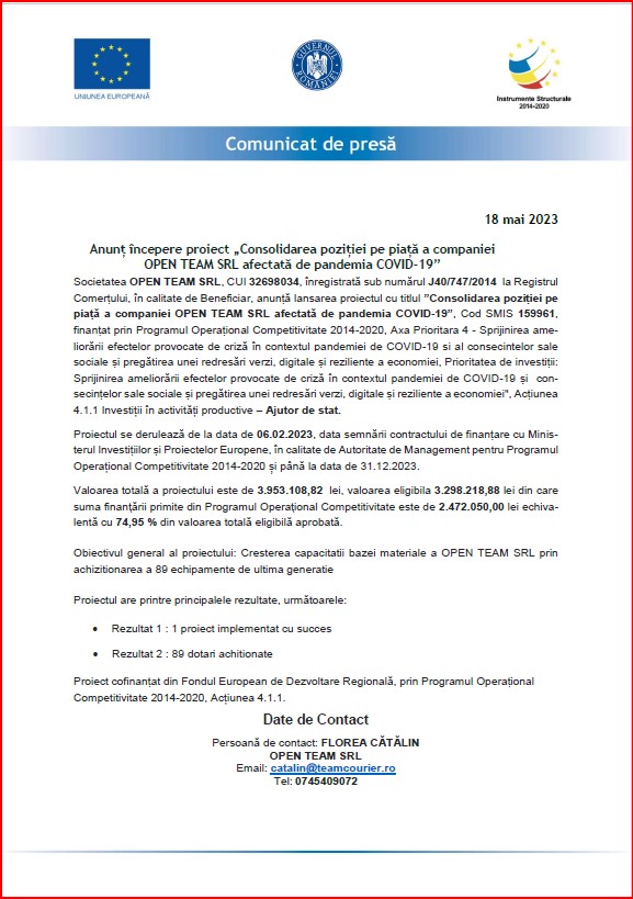Societatea OPEN TEAM SRL, CUI 32698034, înregistrată sub numărul J40/747/2014 la Reg-istrul Comerțului, în calitate de Beneficiar, anunță lansarea proiectul cu titlul ”Consolidarea poziției pe piață a companiei OPEN TEAM SRL afectată de pandemia COVID-19”, Cod SMIS 159961, finanțat prin Programul Operațional Competitivitate 2014-2020, Axa Prioritara 4 – Sprijinirea ameliorării efectelor provocate de criză în contextul pandemiei de COVID-19 și al consecințelor sale sociale și pregătirea unei redresări verzi, digitale și reziliente a economiei, Prioritatea de investiții: Sprijinirea ameliorării efectelor provocate de criză în contextul pan-demiei de COVID-19 și consecințelor sale sociale și pregătirea unei redresări verzi, digitale și reziliente a economiei”, Acțiunea 4.1.1 Investiții în activități productive – Ajutor de stat.