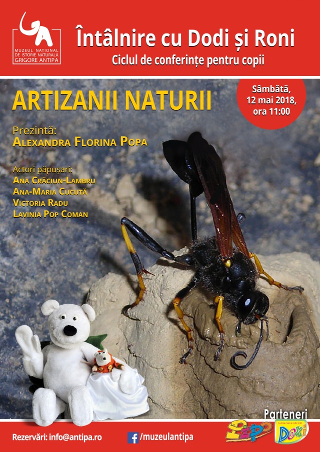 Muzeul Naţional de Istorie Naturală „Grigore Antipa” îi invită pe copii sâmbătă, 12 mai 2018 de la ora 11:00, la o nouă întâlnire cu temerarii exploratori Dodi și Roni care, împreună cu specialistul Muzeului Alexandra Florina Popa, le vor povesti micuților despre câțiva artizani ai naturii.