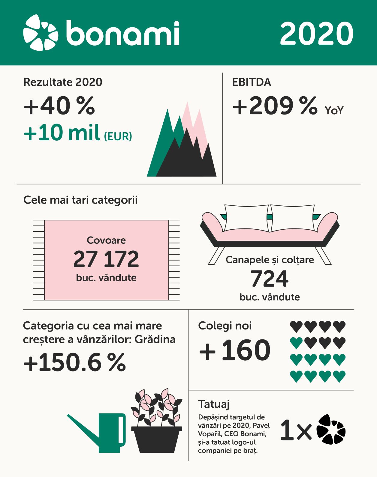 Bonami, magazinul online cu mobilier și decorațiuni, a înregistrat, în ciuda pandemiei, o creștere a vânzărilor cu 19 milioane de euro față de 2019. Compania planifică, pentru 2021, investiții suplimentare și lansarea propriilor mărci. Potrivit CEO-ului companiei, Pavel Vopařil, tot profitul va fi reinvestit în companie și în dezvoltarea acesteia.