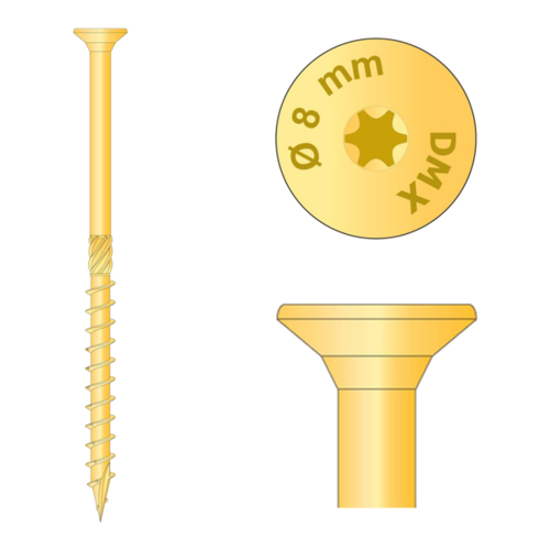 Dimensiune: 5 mm diametru × 80 mm lungime. Material: oțel carbon de calitate superioară. Finisaj: zincat galvanic, acoperit cu rășină pentru reducerea frecării. Filet: parțial, optimizat pentru prindere fermă în lemn. Amprentă: Torx TX25. Vârf: autoforant, nu necesită pregăurire în lemnul moale și mediu. Ambalaj: cutie cu 200 bucăți, ideală pentru proiecte medii și mari. Compatibilitate: funcționează cu șurubelnițe manuale și electrice.