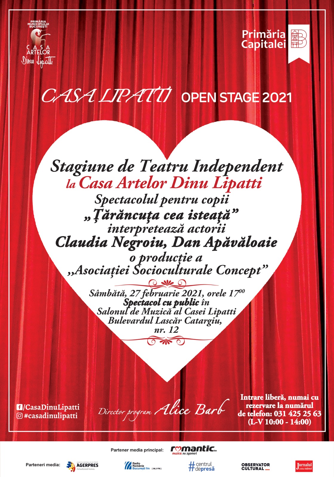 Programul CASA LIPATTI Open Stage 2021 Stagiunea de Teatru Independent este conceput de pianista, actrița și regizoarea Alice Barb, Directorul fondator al Casei Artelor Dinu Lipatti.