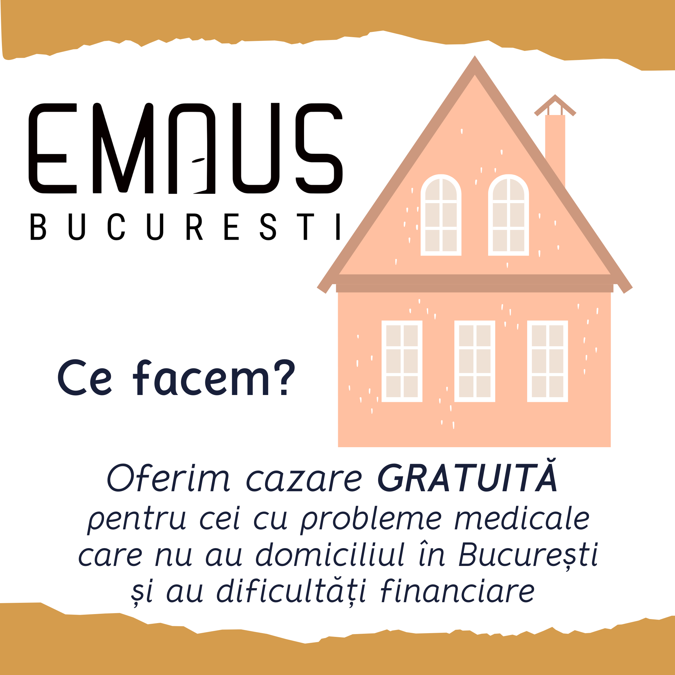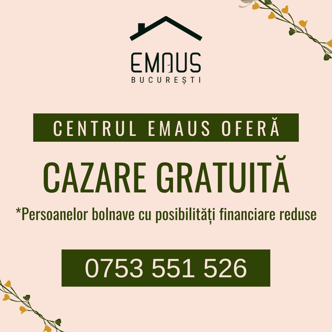 La Centrul EMAUS, găzduim pe termen scurt bolnavi cu posibilități financiare reduse, oferindu-le suport moral și îndrumare, în mod GRATUIT.