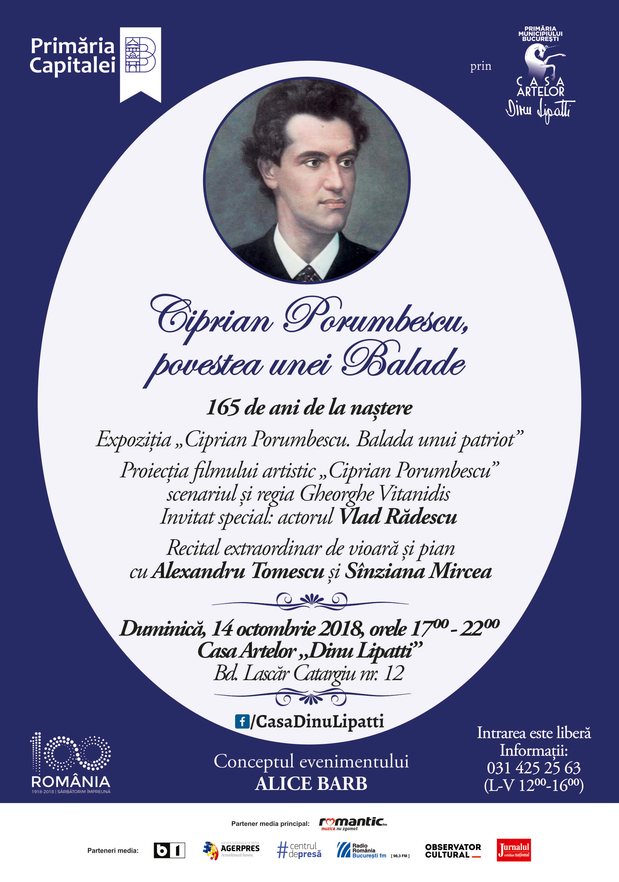 Primăria Municipiului București prin Casa Artelor „Dinu Lipatti” vă invită duminică, 14 octombrie 2018, la evenimentul extraordinar “Ciprian Porumbescu, povestea unei Balade” la Casa Artelor „Dinu Lipatti”, eveniment prilejuit de celebrarea a 165 de ani de la nașterea lui Ciprian Porumbescu.