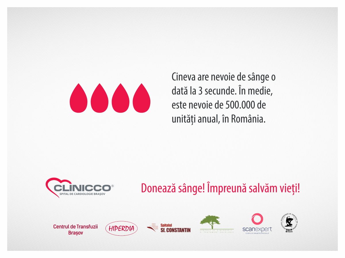 În întâmpinarea Zilei Mondiale a Sănătății, care se sărbătorește pe 7 aprilie, Spitalul de Cardiologie Clinicco împreună cu Centrul de Transfuzii Brașov și Hiperdia organizează a cincea ediție a campaniei de donare de sânge: “Donează sânge! Împreună pentru viață”. Acțiunea va avea loc pe 5 și 6 aprilie 2017 la sediul Centrului de Transfuzii Brașov.