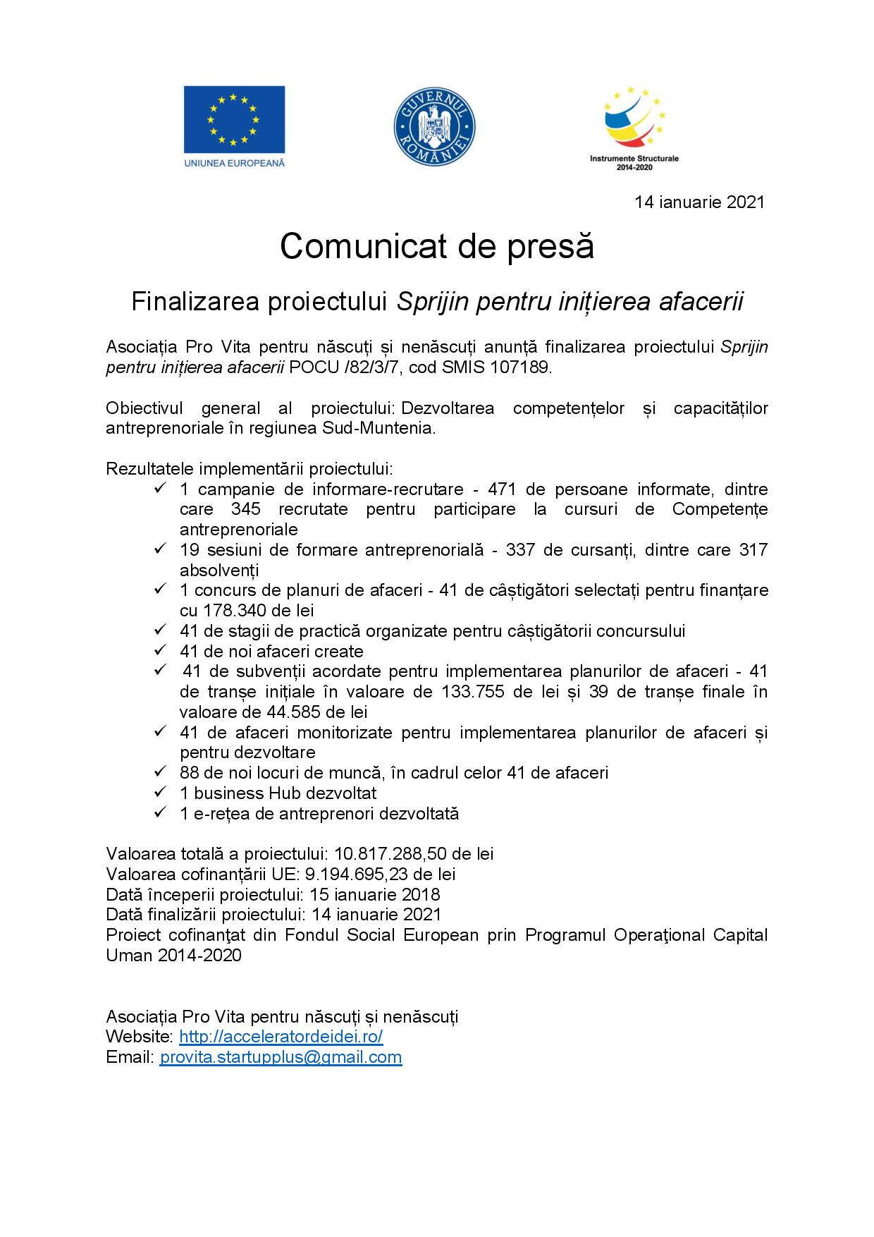 Asociația Pro Vita pentru născuți și nenăscuți anunță finalizarea proiectului Sprijin pentru inițierea afacerii POCU /82/3/7, cod SMIS 107189.