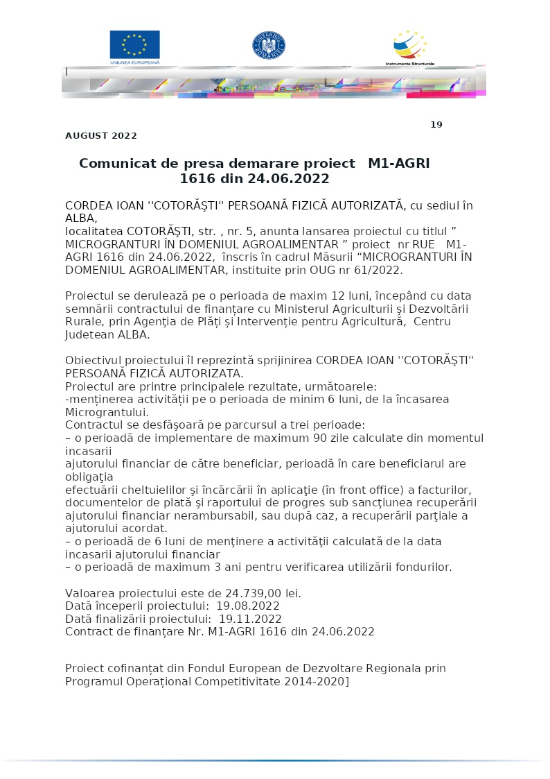 localitatea COTORĂŞTI, str. , nr. 5, anunta lansarea proiectul cu titlul ” MICROGRANTURI ÎN DOMENIUL AGROALIMENTAR ” proiect nr RUE M1-AGRI 1616 din 24.06.2022, înscris în cadrul Măsurii “MICROGRANTURI ÎN DOMENIUL AGROALIMENTAR, instituite prin OUG nr 61/2022.