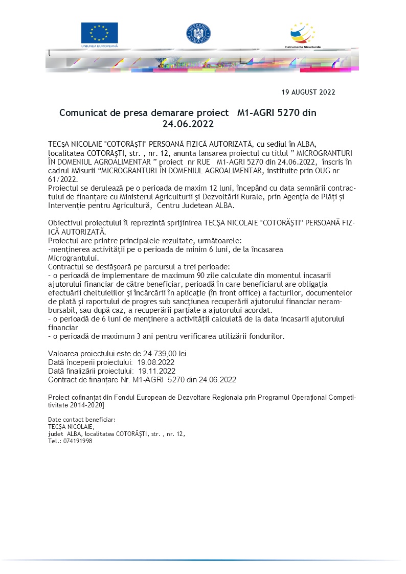 Comunicat de presa demarare proiect M1-AGRI 5270 din 24.06.2022