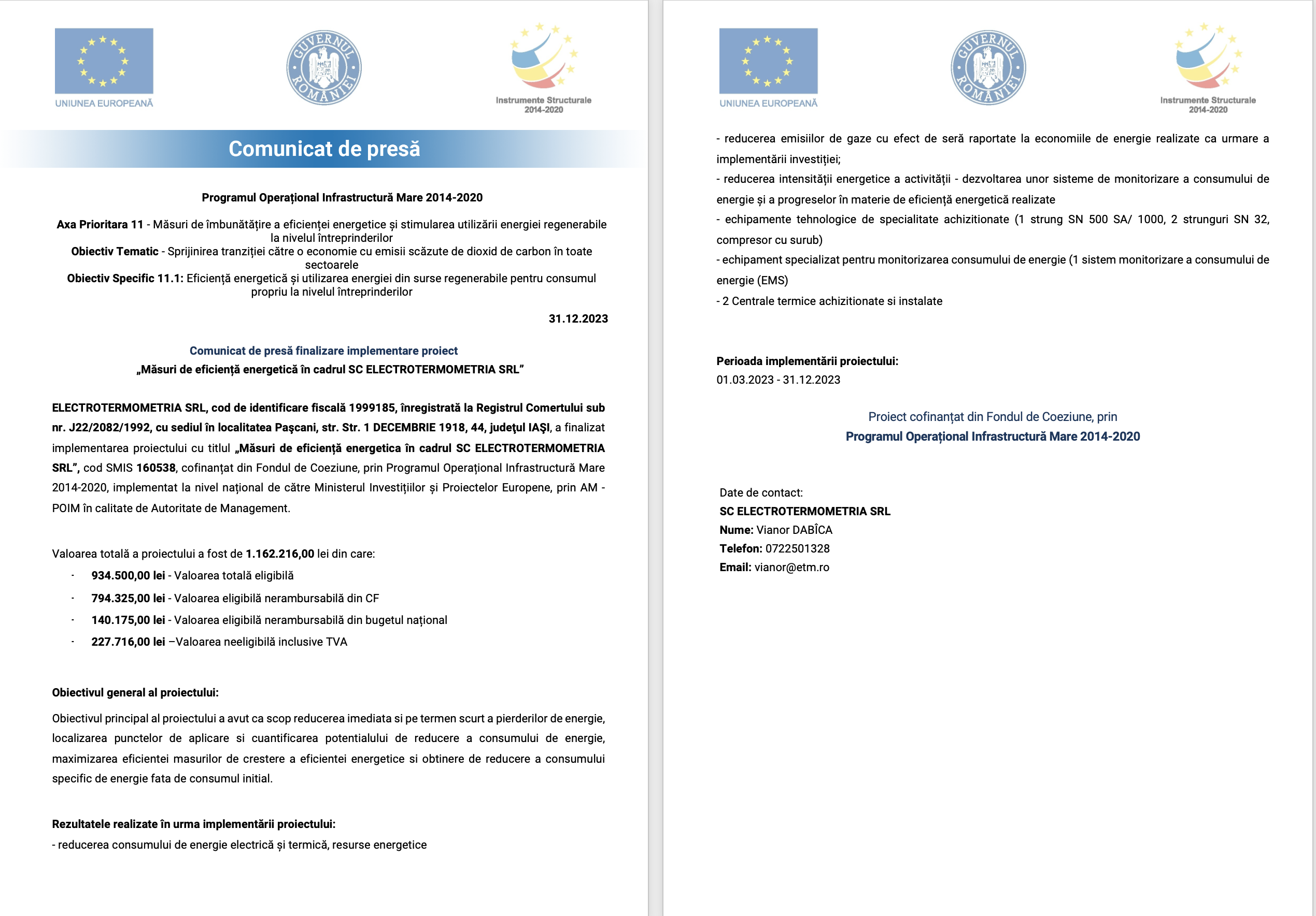 Comunicat de presă finalizare implementare proiect „Măsuri de eficiență energetică în cadrul SC ELECTROTERMOMETRIA SRL”