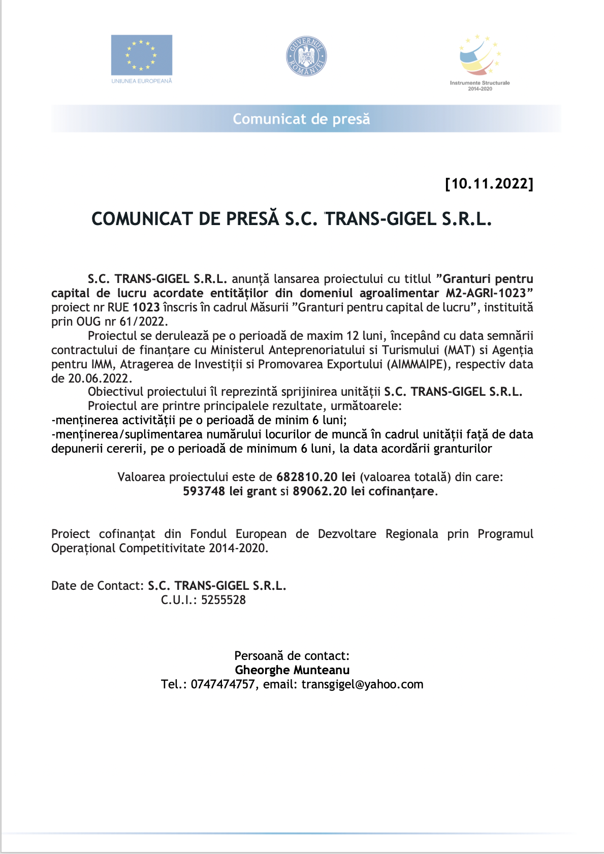 S.C. TRANS-GIGEL S.R.L. anunță lansarea proiectului cu titlul ”Granturi pentru capital de lucru acordate entităților din domeniul agroalimentar M2-AGRI-1023” proiect nr RUE 1023 înscris în cadrul Măsurii ”Granturi pentru capital de lucru”, instituită prin OUG nr 61/2022.