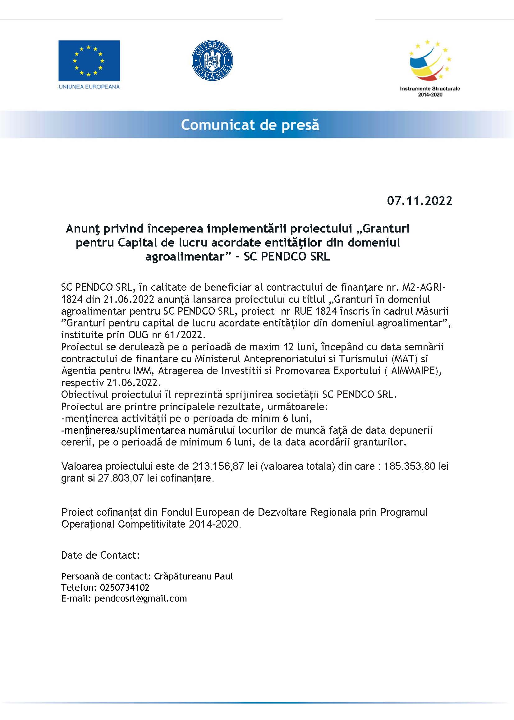 SC PENDCO SRL, în calitate de beneficiar al contractului de finanţare nr. M2-AGRI-1824 din 21.06.2022 anunţă lansarea proiectului cu titlul „Granturi în domeniul agroalimentar pentru SC PENDCO SRL, proiect nr RUE 1824 înscris în cadrul Măsurii ”Granturi pentru capital de lucru acordate entităților din domeniul agroalimentar”, instituite prin OUG nr 61/2022.