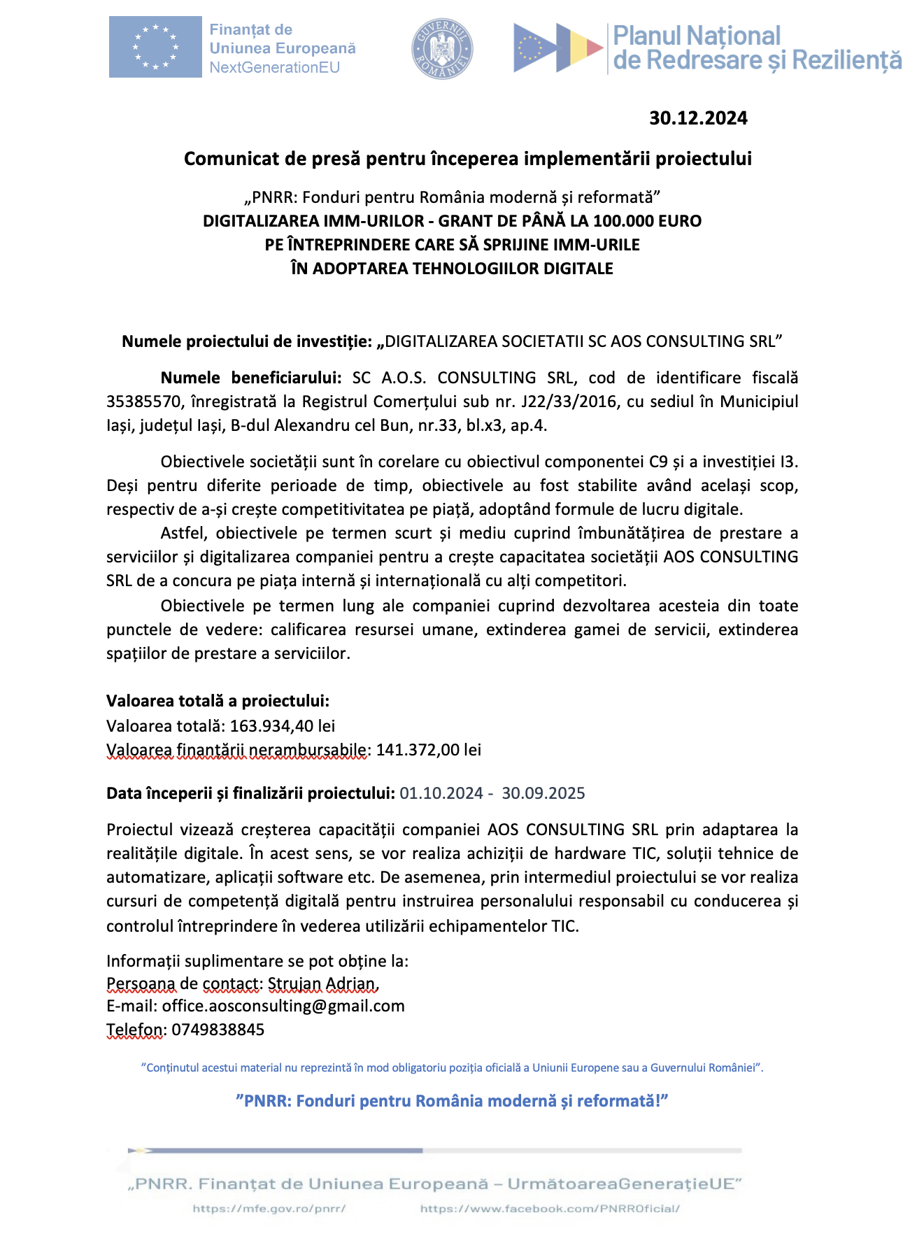 Comunicat de presă pentru începerea implementării proiectului „DIGITALIZAREA SOCIETATII SC AOS CONSULTING SRL”
