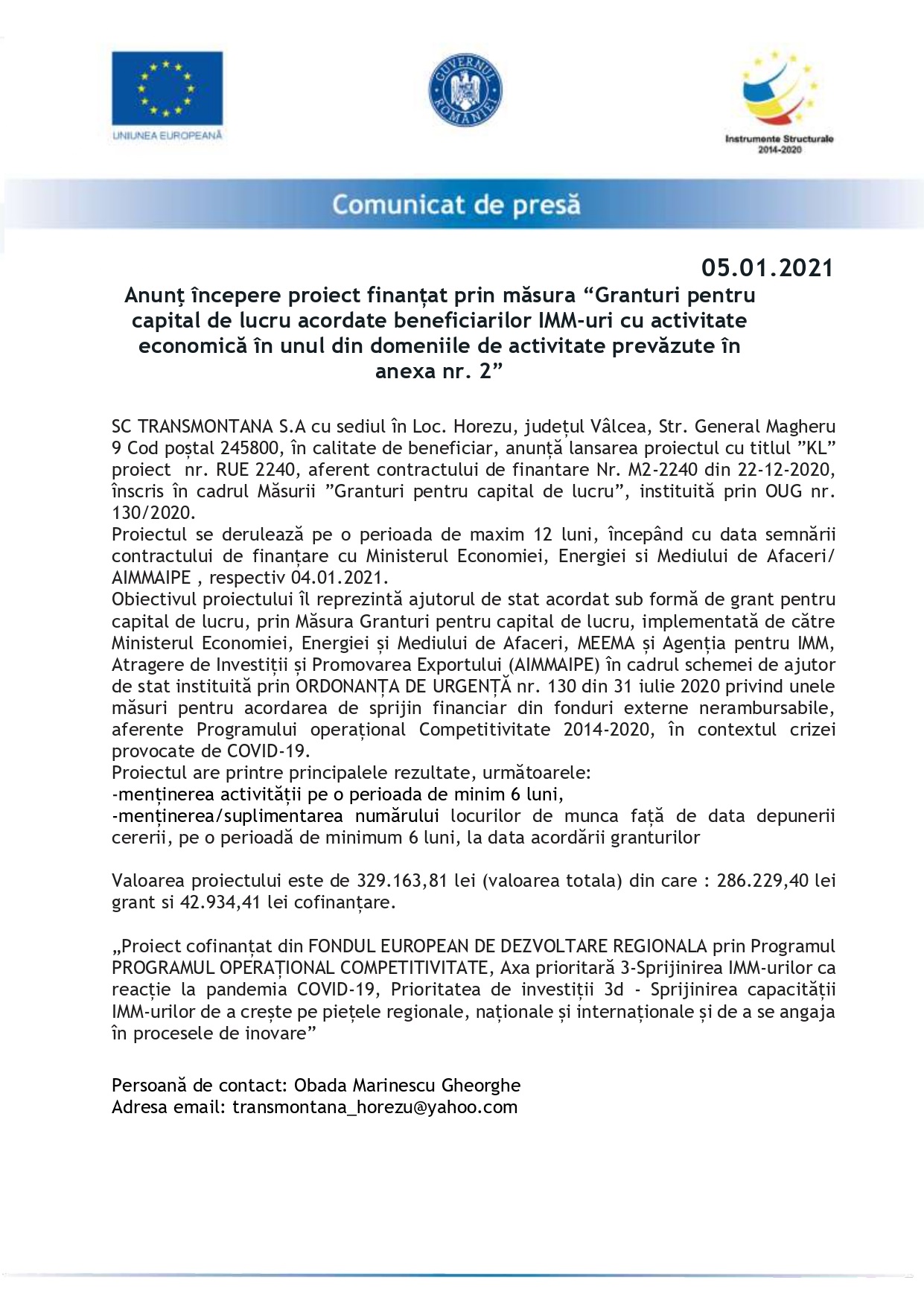 Comunicat de presa TRANSMONTANA SA 05.01 2021