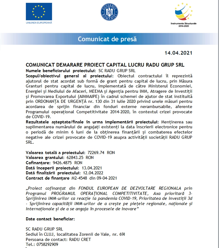 COMUNICAT DEMARARE PROIECT CAPITAL LUCRU RADU GRUP SRL