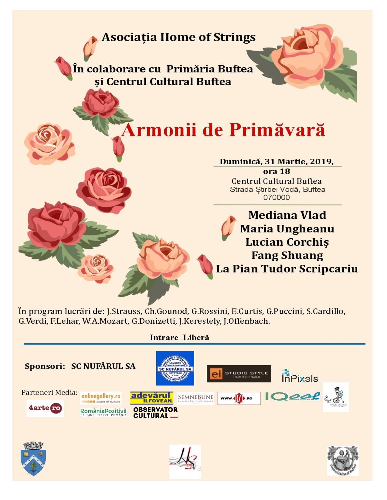 Asociația Home of Strings în colaborare cu Primăria și Centrul Cultural Buftea, Duminică 31 Martie, ora 18, vă invită la spectacolul ,,Armonii de Primăvară’’, unde îi veți întălni pe artiștii lirici Mediana Vlad, Lucian Chorchiș, Fang Shuang și Maria Ungheanu. La pian Tudor Scripcariu. Vor interpreta lucrări ale celebrilor compozitori J.Strauss, E.Curtis, G.Puccini, V.Verdi, G.Rossini.