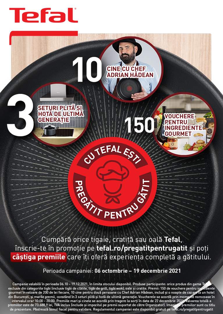 Cumpără orice tigaie, cratiță sau oală Tefal până la 19 decembrie 2021 și înscrie factura/ bonul fiscal pe https://www.tefal.ro/pregatitpentrugatit iar premiile te așteaptă îndată!