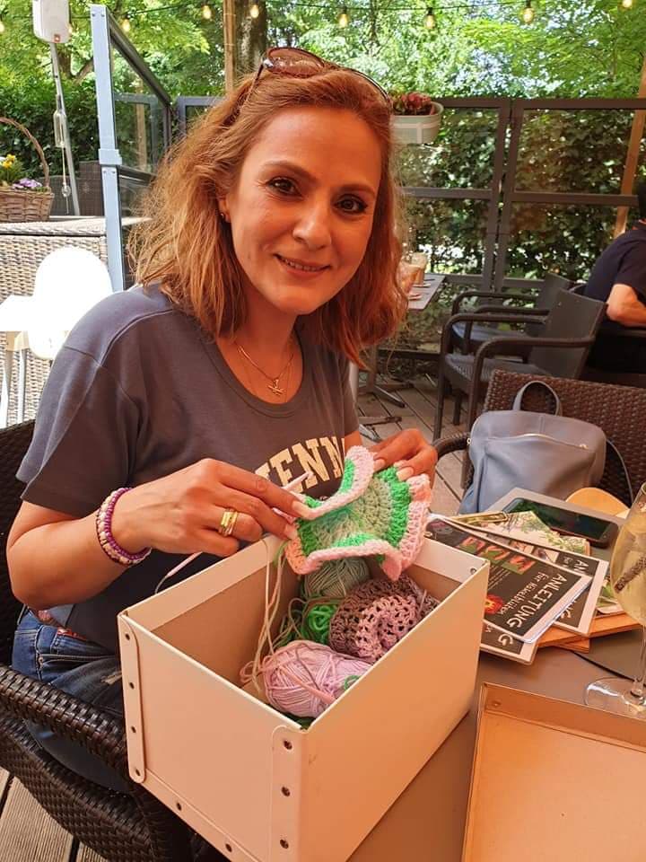 Am învățat să lucrez în copilărie, aveam până-n 10 ani. Bunica mea din partea tatălui, „mamaie munte” – așa îi spuneam eu, lucra mereu: torcea, țesea, croșeta, tricota. Îmi amintesc căsuța cu perdeluțe și cearceafuri tivite cu dantelă făcută de ea. I-am spus într-o zi să-mi arate și mie, mi-a pus vreo 10 ochiuri pe andrele și m-a învățat. Știu că din 10 am făcut 20, și că am strâns așa de tare ața că nu mai puteam mișca nimic. Dar acela a fost începutul… De croșetat, am învățat la școală, doar pașii de bază. În perioada adolescenței mele se purtau tricotajele. Mi-am făcut un pulover gros din lână netoarsă care avea pe toată partea din față un cățel alb. Apoi o perioadă de timp nu am mai lucrat. Până într-o zi când mi-am pierdut fularul preferat. Mi-l cumpărasem de la New York, era ca o eșarfă cu glugă (țineam tare mult la el)! Și cum n-am găsit nicăieri , am zis că trebuie să-mi fac eu. Între timp apăruse internetul în viața noastră și acolo am găsit multe modele și tutoriale din care m-am inspirat. Așa am descoperit corșetatul care a devenit o mare pasiune!