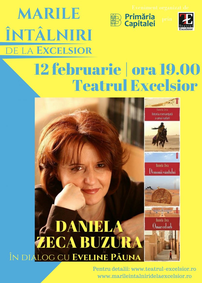 Luni, 12 februarie, la ora 19.00, bucureștenii sunt invitați la o nouă ediție a Marilor Întâlniri de la EXCELSIOR. Renumita scriitoare Daniela Zeca Buzura se va afla afla în dialog cu jurnalista Eveline Păuna, pe scena Sălii „Ion Lucian” a Teatrului EXCELSIOR.