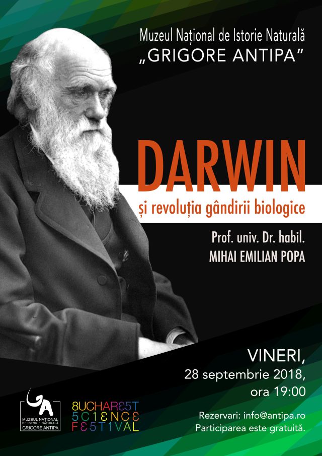 Vineri, 28 septembrie 2018, de la ora 19.00, Muzeul Național de Istorie Naturală „Grigore Antipa” vă invită la evenimentul „Darwin și revoluția gândirii biologice”, realizat în cadrul săptămânii Bucharest Science Festival. Conferința va avea loc în Sala Insectelor de la etajul Muzeului și va fi susținută de către Prof. univ. Dr. habil. Mihai Emilian Popa de la Universitatea din București, Facultatea de Geologie și Geofizică.