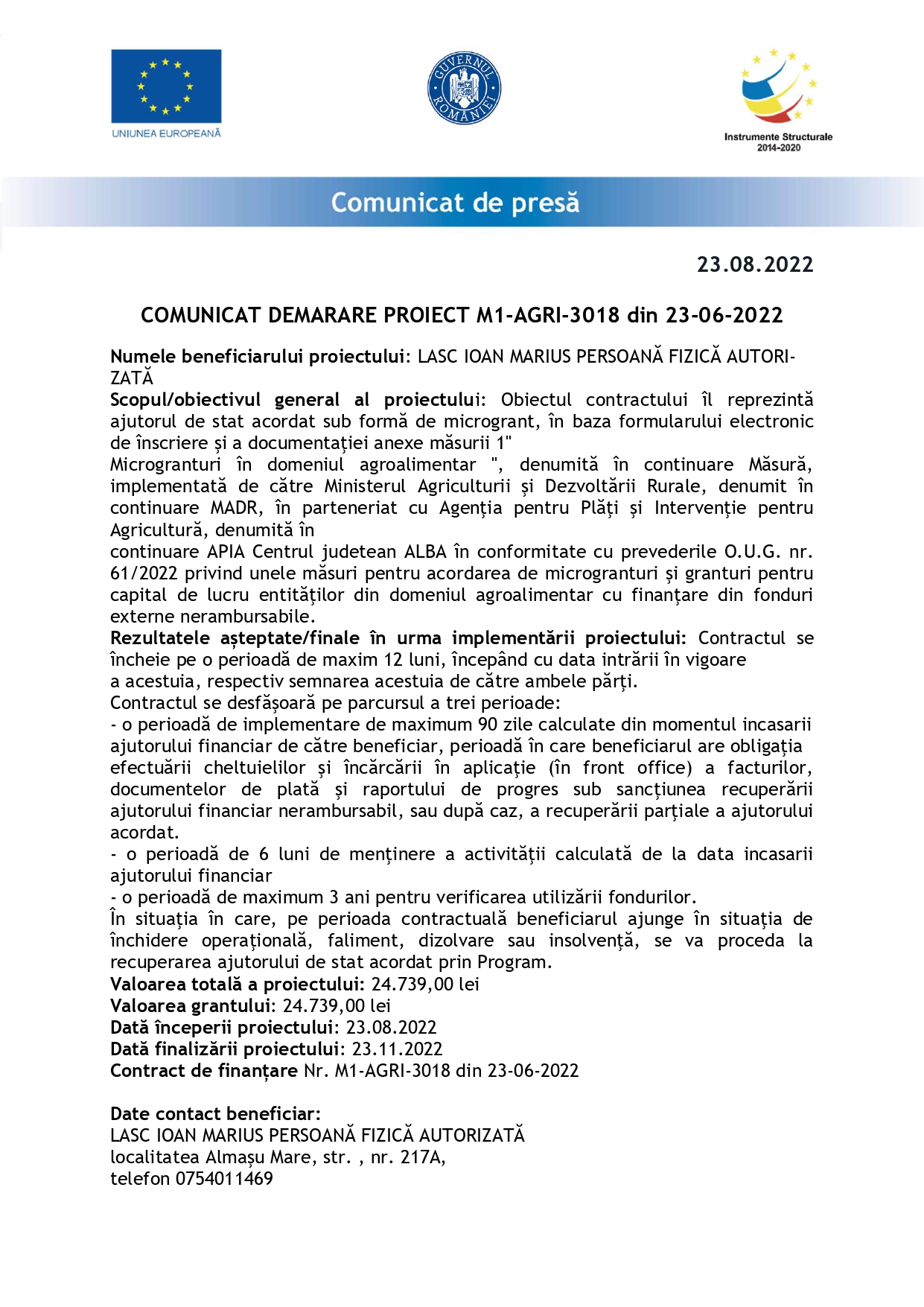 COMUNICAT DEMARARE PROIECT M1-AGRI-3018 din 23-06-2022