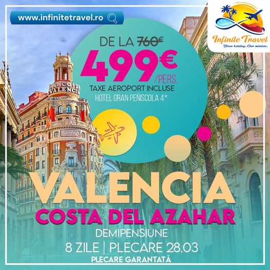 Campulung, 15.03.2024 – Îți dorești să evadezi într-o vacanță de vis la prețuri accesibile? Acum este momentul perfect să faci primul pas către aventura ta în Costa del Azahar – Valencia! Infinite Travel îți aduce o ofertă incredibilă pentru un sejur de 8 zile, cu plecare programată pe 28.03.2024, transport cu avionul inclus și toate acestea la doar 499€ per persoană, taxe incluse!