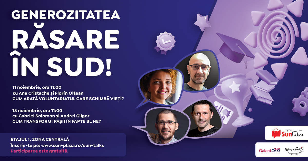 Ana Cristache și Florin Oltean, alături de Gabriel Solomon și Andrei Gligor, vorbesc în această toamnă la seminariile Sun Talks din Sun Plaza despre generozitate, despre activitatea de voluntariat, dar și despre puterea și satisfacția pe care o aduce o astfel de implicare.