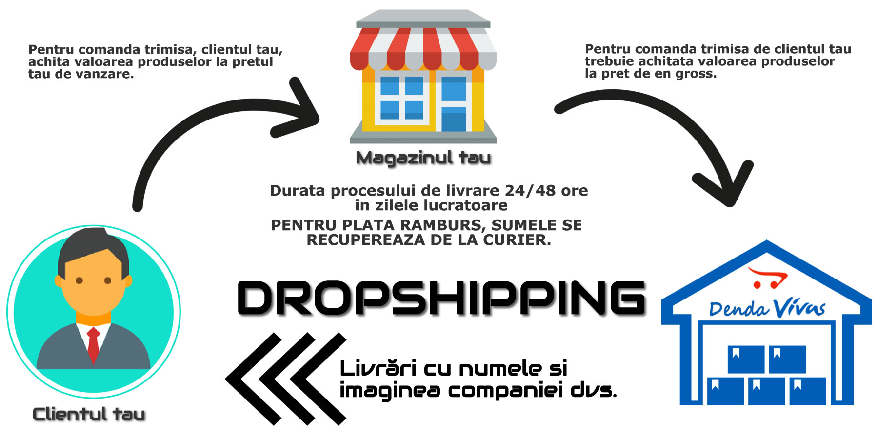 Practic tu ca deținător al magazinului online iti vei asuma rolul de ”intermediar” intre clientul ce plaseaza comanda pe site si furnizorul ce trimite clientului produsele comandate.