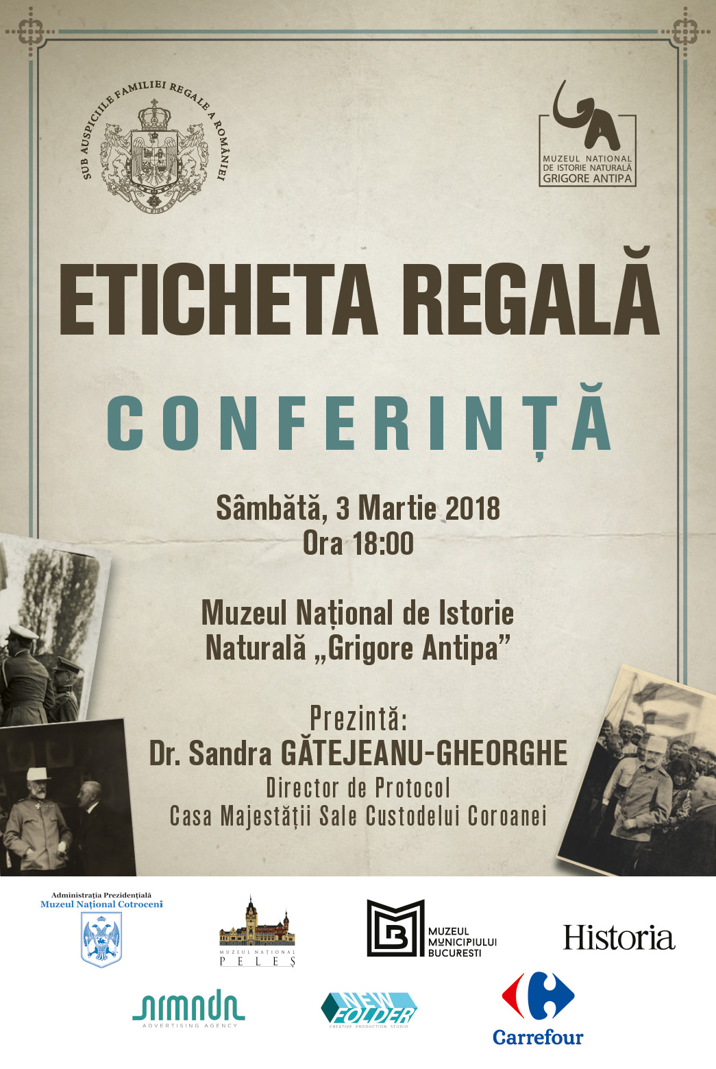 Muzeul Naţional de Istorie Naturală „Grigore Antipa” vă invită să participați la conferința „Eticheta Regală”, care va avea loc sâmbătă, 3 martie 2018 de la ora 18:00 și va fi susținută de către Dr. Sandra Gătejeanu Gheorghe, Director de Protocol al Casei Majestății Sale Custodelui Coroanei.