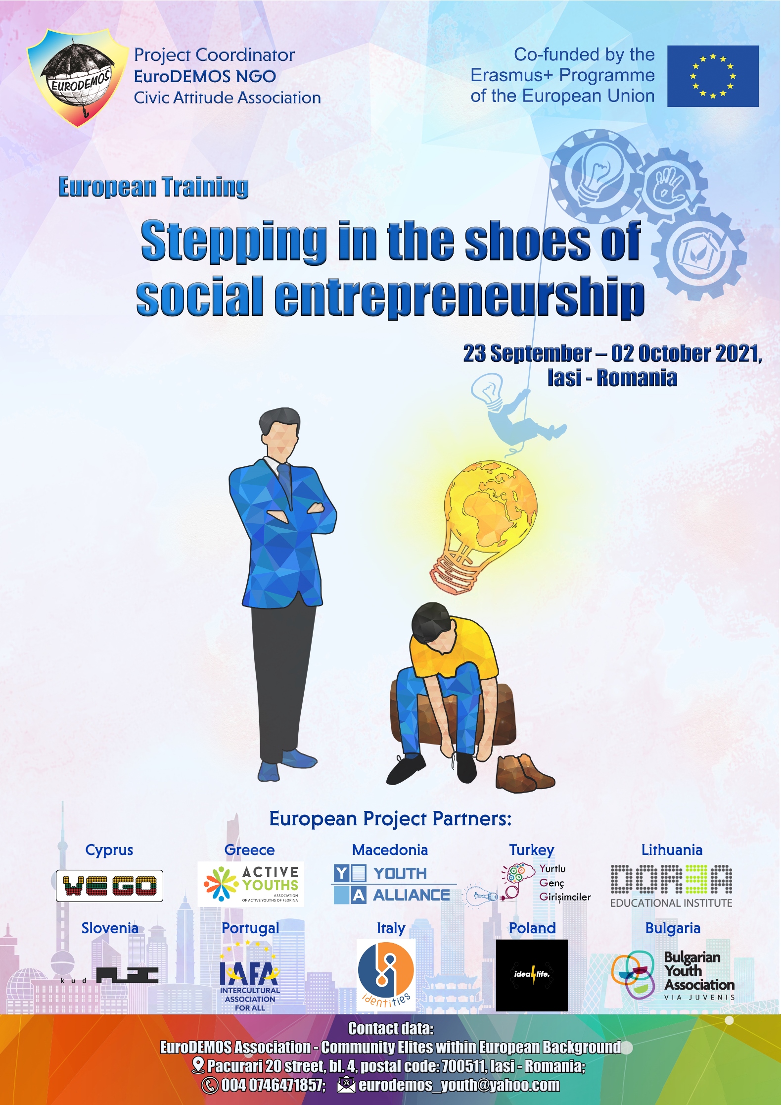 Asociația EuroDEMOS implementează în perioada 23 septembrie – 02 octombrie 2021, la Iași, trainingul european dedicat formării și dezvoltării abilităților antreprenoriale în rândul tinerilor. Trainingul face parte din proiectul european „Stepping in the shoes of social entrepreneurship”, proiect co-finanțat prin ProgramulErasmus+ al Uniunii Europene.