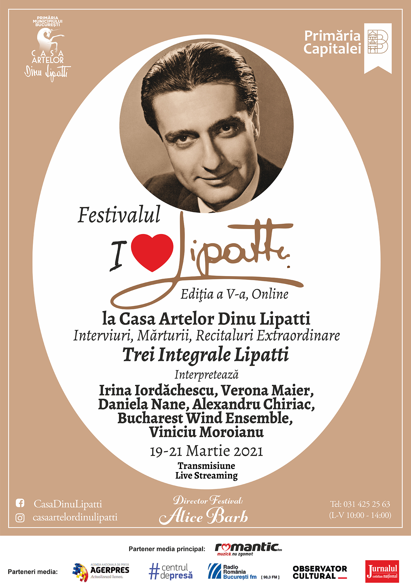 Casa Artelor Dinu Lipatti vă invită în perioada 19-21 martie 2021 la cea de-a V-a Ediție a Festivalului „I love Lipatti”, Ediție Online dedicată împlinirii a 104 ani de la nașterea compozitorului și celui mai mare pianist român al tuturor timpurilor, Dinu Lipatti (19 martie 1917 – 2 decembrie 1950), precum și aniversării a trei ani de la inaugurarea Centrului Cultural Casa Artelor Dinu Lipatti.