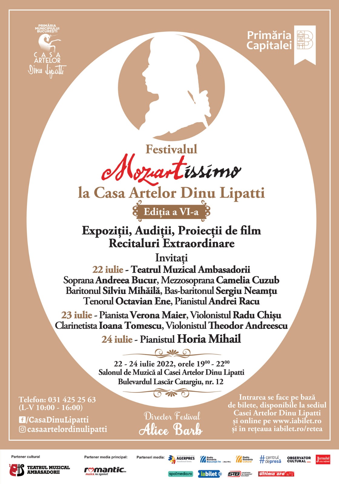 Casa Artelor Dinu Lipatti organizează cea de-a VI-a Ediție a Festivalului Mozartissimo – vineri, sâmbătă și duminică, 22-24 iulie 2022, în Salonul de Muzică și în Curtea Casei Lipatti în intervalul orar 19:00 – 22:00.