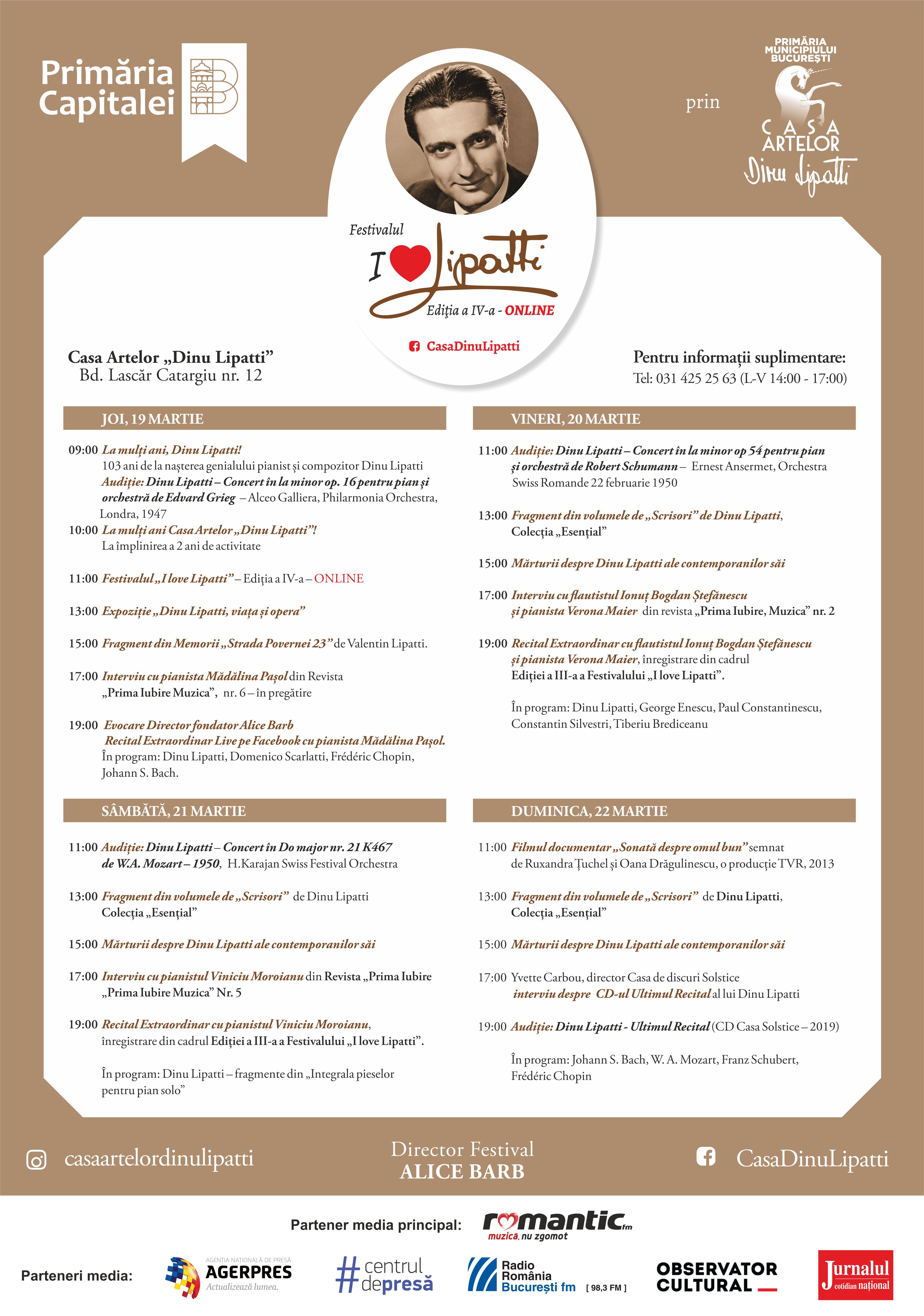 Primăria Municipiului București, prin Casa Artelor „Dinu Lipatti”, organizează în perioada 19-22 martie 2020 cea de-a IV-a Ediție a Festivalului „I Love Lipatti”- ONLINE.