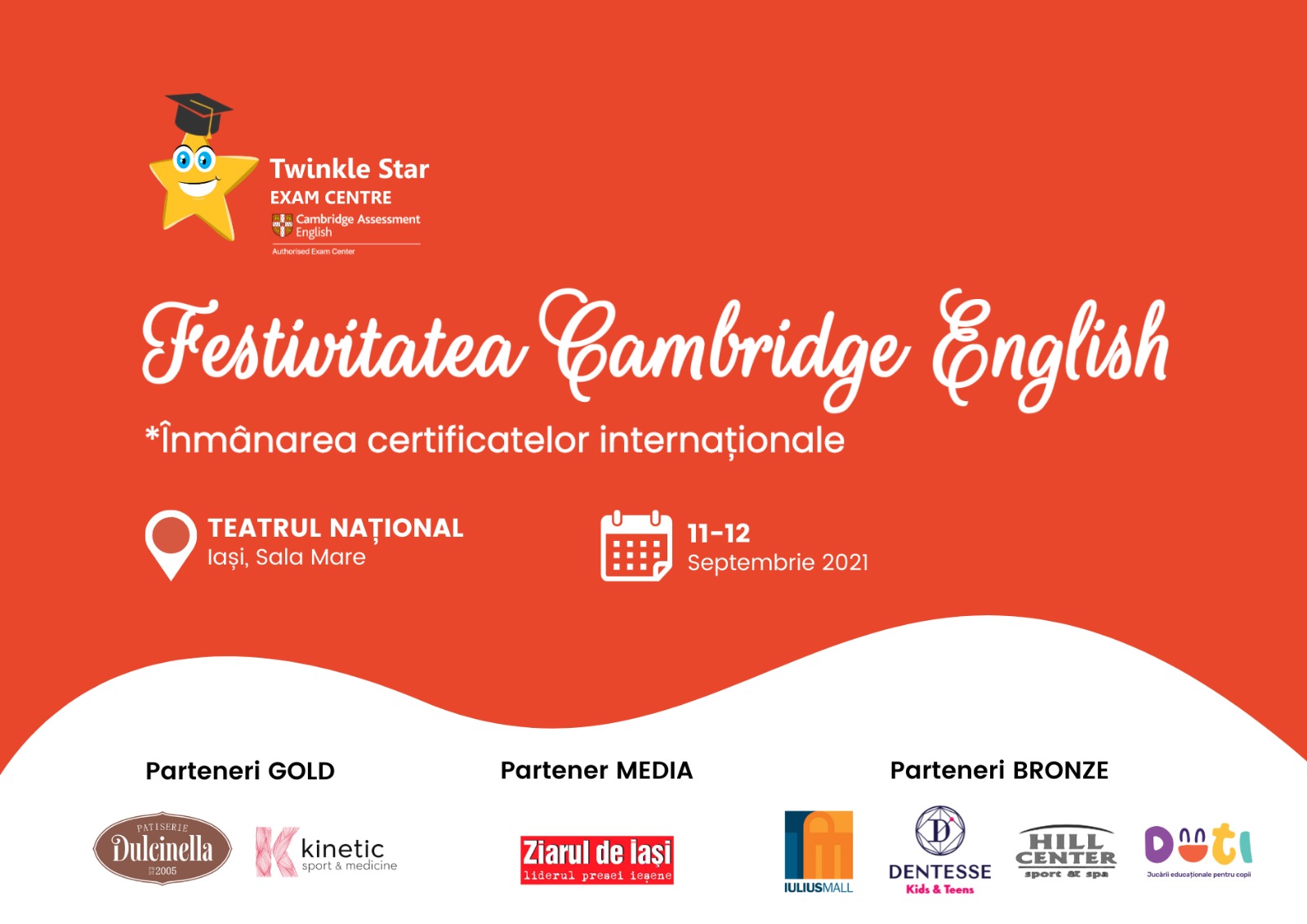 ~ cel mai important eveniment anual din calendarul evenimentelor educaționale Cambridge English organizate în Iași, va avea loc la Teatrul Național “Vasile Alecsandri” Iași – Sala Mare, pe 11 și 12 septembrie. Cele 9 serii de participanți însumează 1.346 de elevi din județul Iași care s-au pregătit în cadrul centrului lingvistic Twinkle Star și au susținut un examen Cambridge English în perioada august 2020-august 2021. Fiecare candidat va avea maxim 2 însoțitori, evenimentul fiind organizat cu respectarea tuturor măsurilor necesare pentru prevenirea contaminării cu noul coronavirus SARS-CoV-2 și a regulilor de acces și distanțare stabilite de teatru.