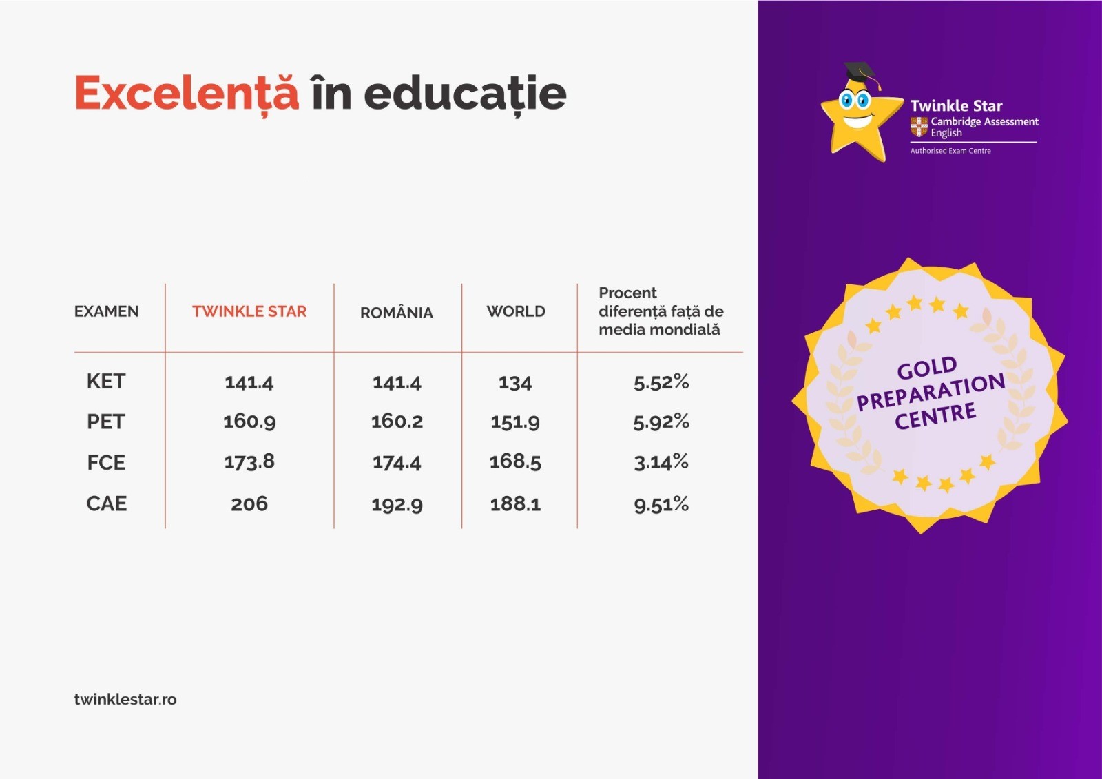 Twinkle Star este cel mai mare centru de pregătire pentru examene Cambridge din România, cu peste 4.500 de cursanți. Centrul are o experiență de 12 ani în pregătirea candidaților, fiind acreditat și premiat „Cel mai bun centru de pregătire Cambridge Step-by-Step din România” și “Gold Preparation Centre 2021” de Cambridge Assessment English – departamentul de examene din cadrul Universității Cambridge din Marea Britanie. Pe lângă cursurile de pregătire, centrul Twinkle Star este unul dintre cele 9 centre din România autorizate să organizeze examene Cambridge English.