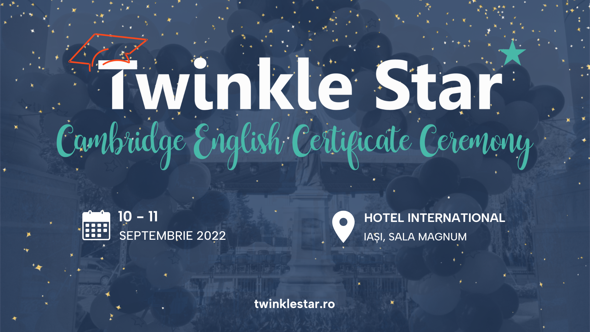 ~ cel mai important eveniment anual din calendarul evenimentelor educaționale Cambridge English organizate în Iași, va avea loc la Hotel Internațional Iași – Sala Magnum, pe 10 și 11 septembrie. Cele 9 serii de participanți însumează 1.449 de elevi din județul Iași care s-au pregătit în cadrul centrului lingvistic Twinkle Star și au susținut un examen Cambridge English în perioada august 2021-iulie 2022 și peste 160 de candidați de la școli partenere.