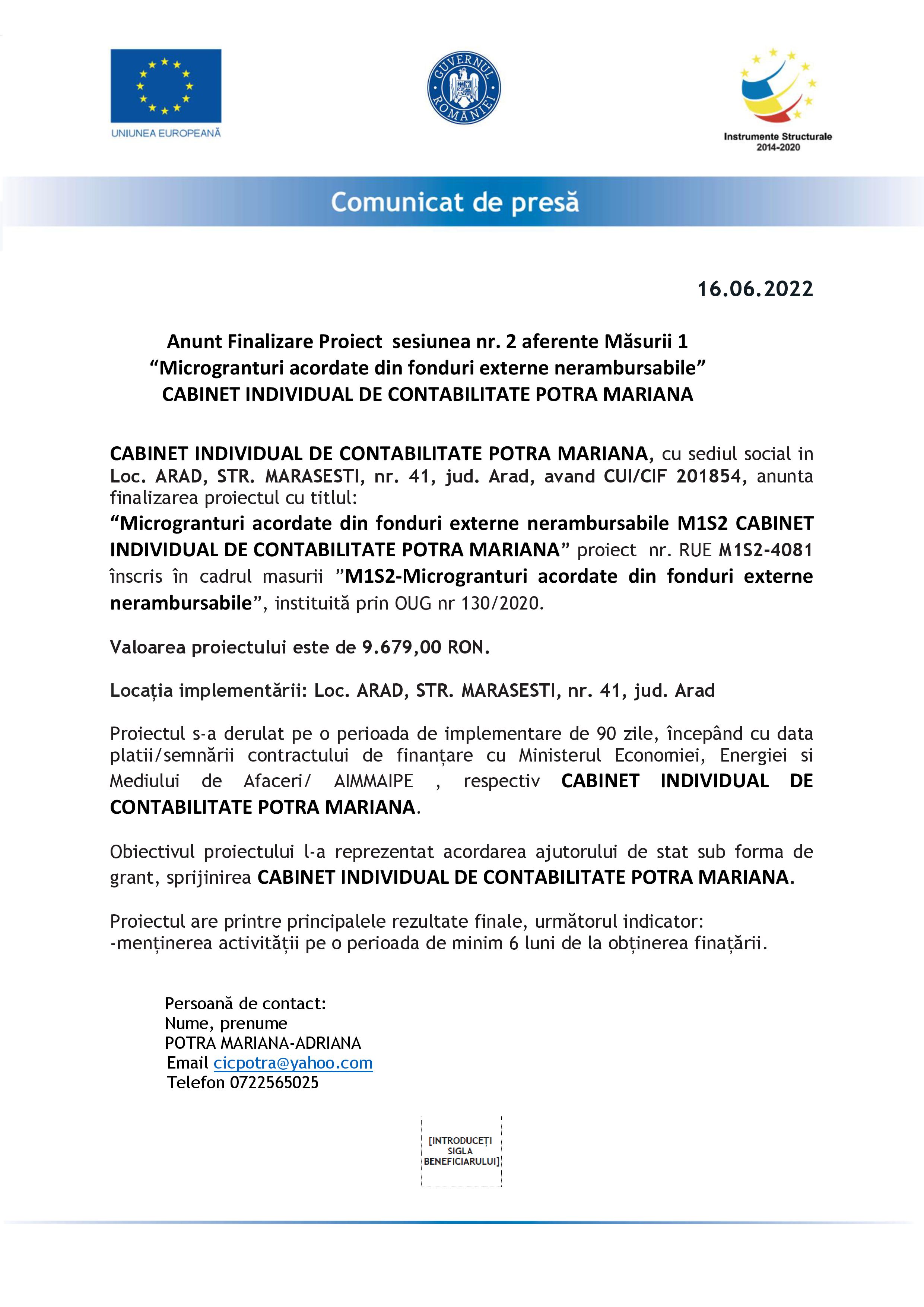 Anunt Finalizare Proiect sesiunea nr. 2 aferente Măsurii 1 “Microgranturi acordate din fonduri externe nerambursabile” CABINET INDIVIDUAL DE CONTABILITATE POTRA MARIANA