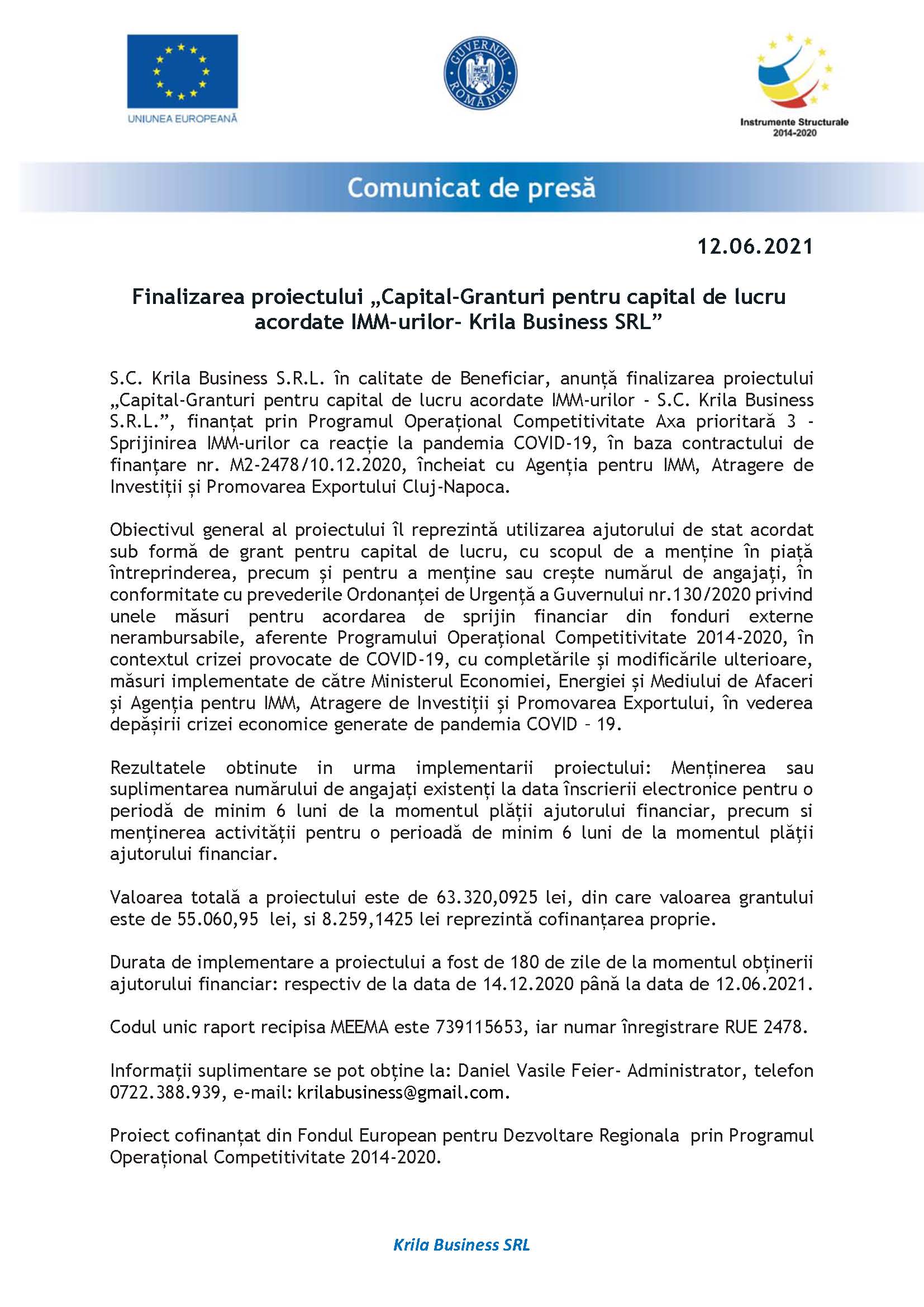 S.C. Krila Business S.R.L. în calitate de Beneficiar, anunță finalizarea proiectului „Capital-Granturi pentru capital de lucru acordate IMM-urilor – S.C. Krila Business S.R.L.”, finanțat prin Programul Operațional Competitivitate Axa prioritară 3 – Sprijinirea IMM-urilor ca reacție la pandemia COVID-19, în baza contractului de finanţare nr. M2-2478/10.12.2020, încheiat cu Agenția pentru IMM, Atragere de Investiții și Promovarea Exportului Cluj-Napoca.