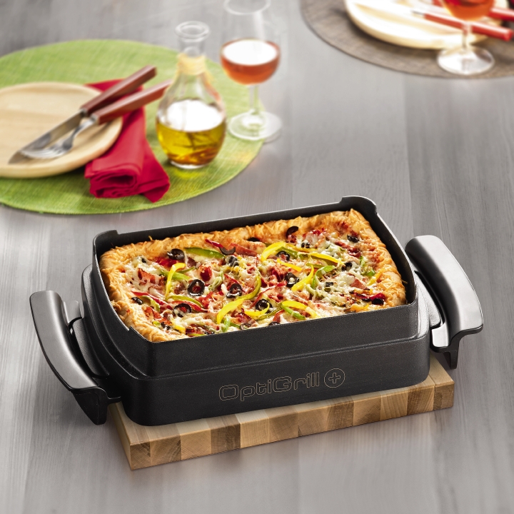Chef Tefal OptiGrill®+ Snacking&Backing îți transformă bucătăria într-un Wonderland al Aromelor alese cu stil. Un promotor al festinului culinar, datorită accesoriului special de coacere, poți prepara acasă pizza savuroasă, tarte sau prăjituri care cuceresc din prima.