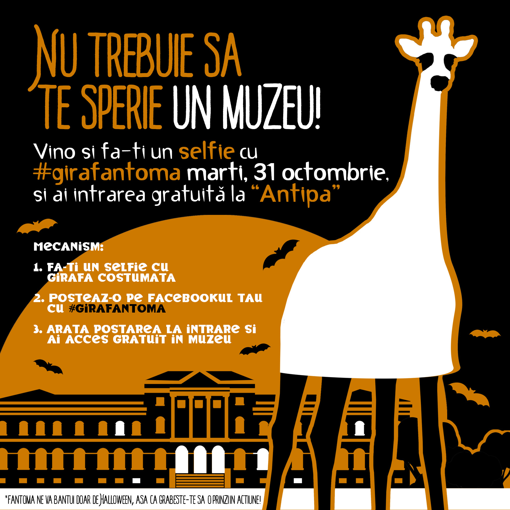 Pentru a vorbi pe înțelesul lor și pentru a facilita accesul la un astfel de eveniment, ne-am gândit să le facem cunoștință cu Girafantoma. Este Girafa „Antipa” care s-a gândit să se costumeze în fantomă de Halloween. Mai mult decât atât, este dornică să facă selfie-uri cu oricine își dorește asta și îi recompensează cu intrare gratuită la muzeu pe toți cei care postează selfie-ul împreună cu #girafantoma pe paginile lor.