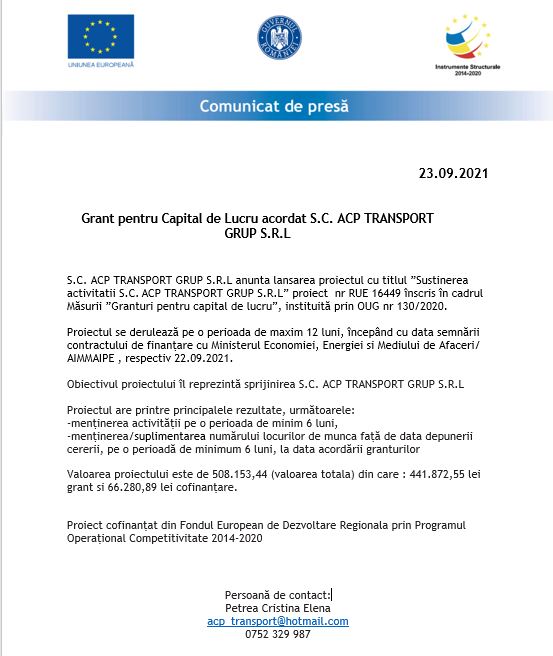 S.C. ACP TRANSPORT GRUP S.R.L anunta lansarea proiectul cu titlul ”Sustinerea activitatii S.C. ACP TRANSPORT GRUP S.R.L” proiect nr RUE 16449 înscris în cadrul Măsurii ”Granturi pentru capital de lucru”, instituită prin OUG nr 130/2020.