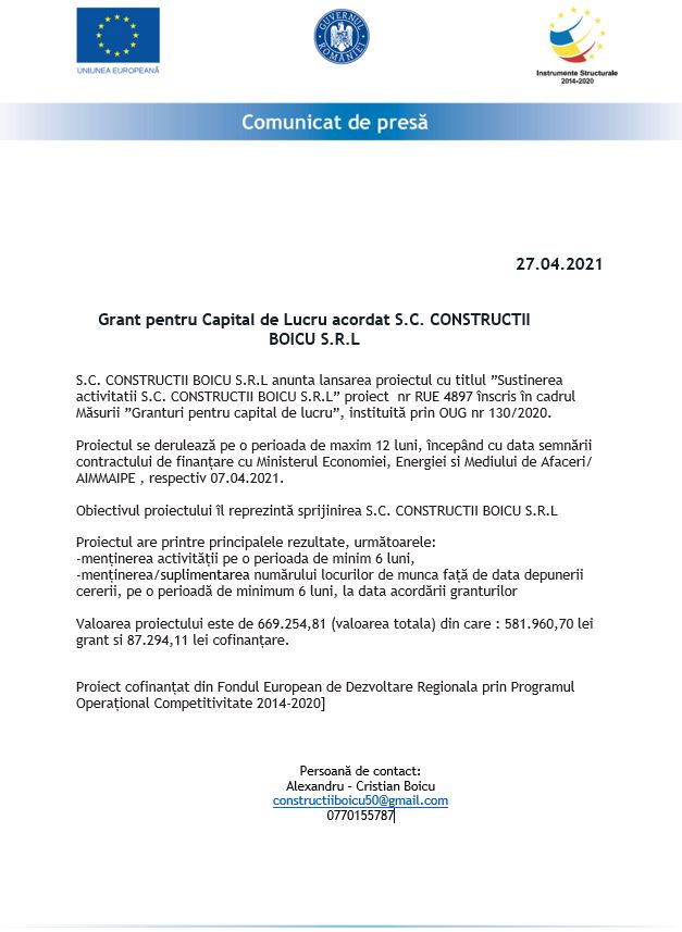 S.C. CONSTRUCTII BOICU S.R.L anunta lansarea proiectul cu titlul ”Sustinerea activitatii S.C. CONSTRUCTII BOICU S.R.L” proiect nr RUE 4897 înscris în cadrul Măsurii ”Granturi pentru capital de lucru”, instituită prin OUG nr 130/2020.